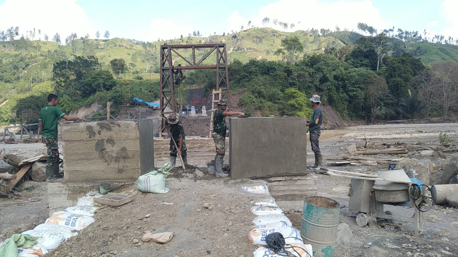 Selain itu, mobilisasi material pembangunan telah berjalan optimal. Material yang telah tersedia di lokasi antara lain semen sebanyak 490 sak, besi berbagai ukuran, pasir 13 truk, kerikil dan batu split lima truk, sling baja, tiang tower, angkur seling, roda seling, hingga perlengkapan pengecatan dan baut pengikat.