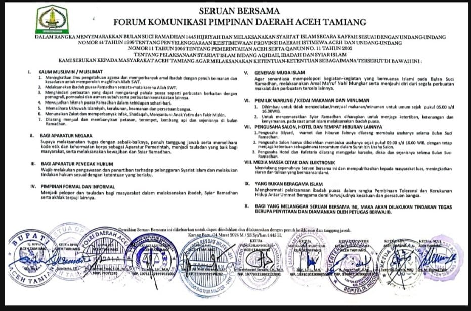 Pemerintah Kabupaten Aceh Tamiang bersama Forkopimda mengeluarkan seruan bersama dan imbauan terkait pelaksanaan ibadah selama bulan bulan suci Ramadhan 1445 Hijriah tahun 2024. Seruan bersama yang ditandatangani pada 04 Maret 2024 ini dibuat bertujuan untuk menjaga kekhusyukan dalam beribadah, dimana terdapat beberapa anjuran dan himbauan yang harus ditaati masyarakat, ASN, Aparatur Penegak Hukum, Pimpinan Formal dan Informal, Pemilik warung/kedai makanan dan minuman serta pengusaha selama pelaksanaan ibadah bulan ramadhan.