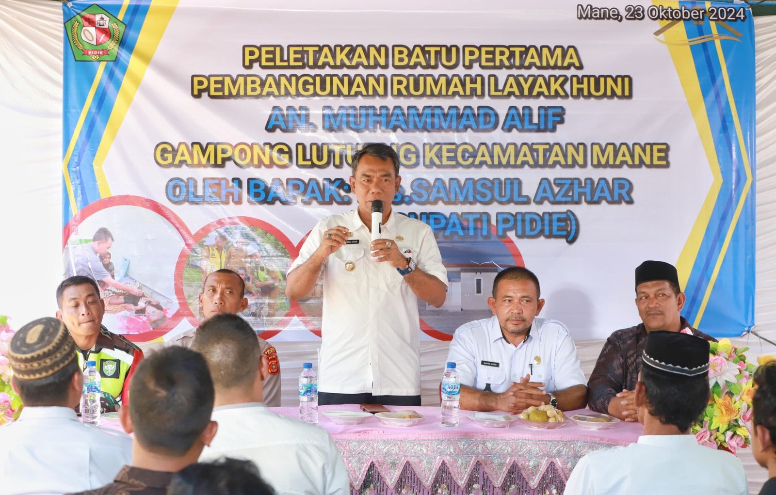 Sigli,satupena.co.id: Penjabat Bupati Pidie, Drs. Samsul Azhar didampingi Plt. Kabag Protokol dan Komunikasi Pimpinan (Prokopim) Muhammad Ady Rizka, S.STP., M.Si., melaksanakan peletakan batu pertama pembangunan Rumah Layak Huni (RLH) untuk warga miskin di Gampong Lutueng, Kecamatan Mane, Rabu, (23/10/2024).