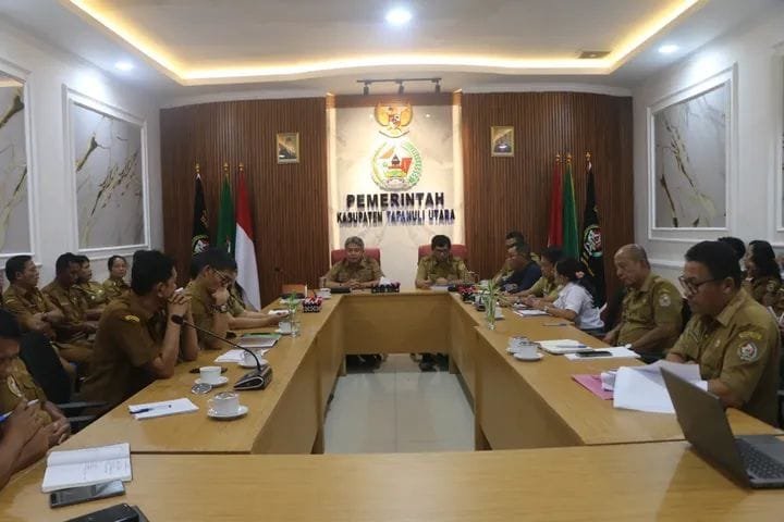 wakil Bupati Tapanuli Utara Dr. Deni Parlindungan Lumbantoruan, M.Eng didampingi Sekretaris Daerah Drs. Henry M. M. Sitompul, M.Si memimpin rapat bersama para perangkat daerah teknis serta para camat membahas penyaluran Bantuan Jaminan Hidup (Jadup) bagi masyarakat terdampak bencana hidrometeorologi, bertempat di Ruang Rapat Mini Kantor Bupati Tapanuli Utara, Senin (9/3/2026).
