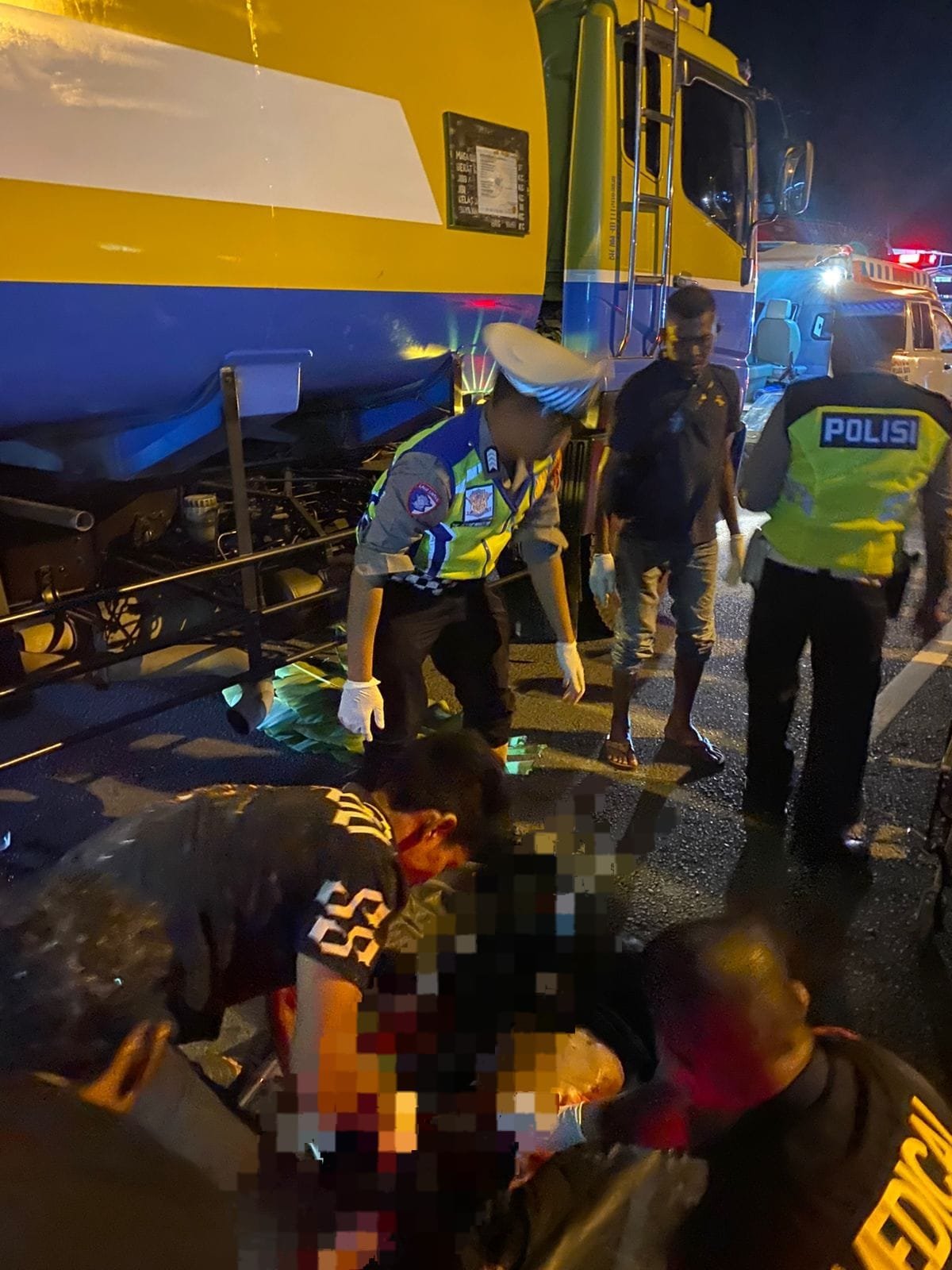 “Karena jarak yang sangat dekat, tabrakan tak dapat dihindari. Sepeda motor korban jatuh ke bawah truk tangki dan pengendaranya terlindas ban belakang, hingga meninggal dunia di tempat,” ujar Kasat Lantas.