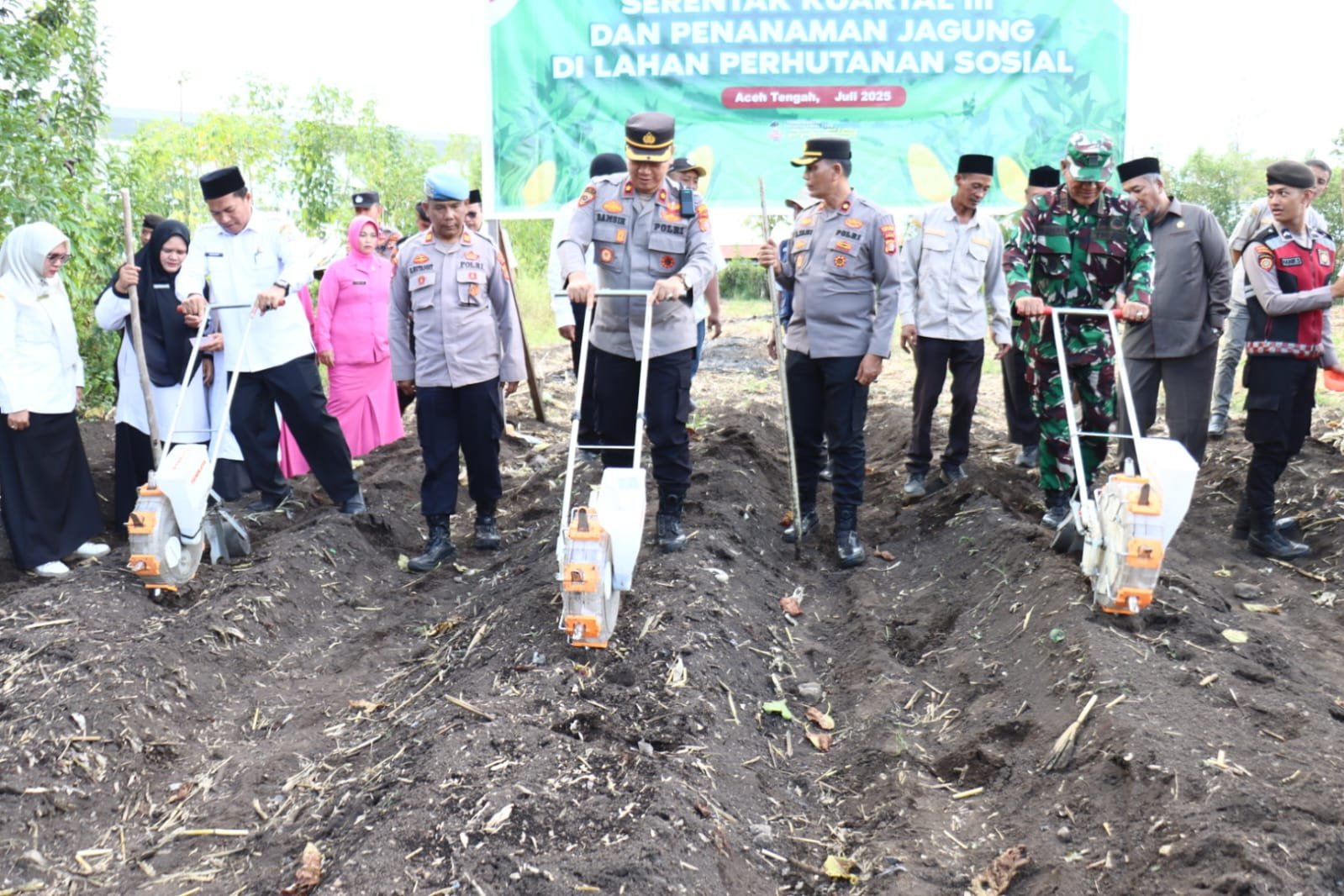 Polres Aceh Tengah, Polda Aceh, melaksanakan kegiatan Penanaman Jagung Serentak Kuartal III Tahun 2025 yang juga dirangkai dengan penanaman jagung di lahan perhutanan sosial pada Rabu siang (9/7/2025).