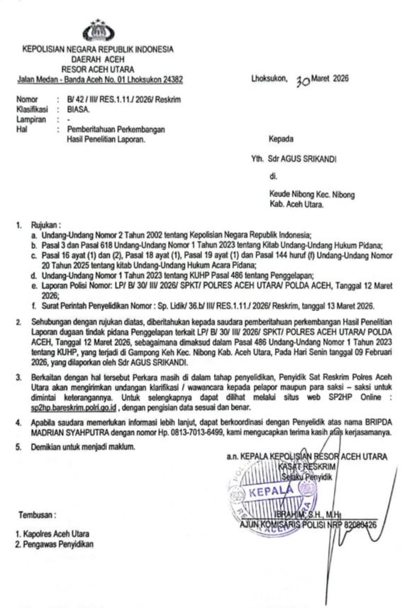 Kasus ini ditangani penyidik Satuan Reserse Kriminal Polres Aceh Utara, sebagaimana tertuang dalam Surat Pemberitahuan Perkembangan Hasil Penyelidikan (SP2HP) nomor B/42/III/Res 1.11/2026/Reskrim tertanggal 30 Maret 2026. Penyelidikan mengacu pada surat perintah penyelidikan nomor Sp Lidik/36.b/III/Res 1.11/2026/Reskrim tertanggal 13 Maret 2026.