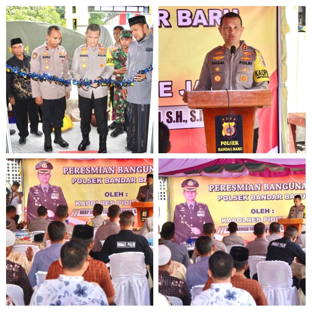 Pidie Jaya – Kapolres Pidie Jaya, AKBP Ahmad Faisal Pasaribu, S.H., S.I.K., M.H., meresmikan gedung baru Polsek Bandar Baru di Gampong Keude Lueng Putu pada Kamis, 3 Oktober 2024.