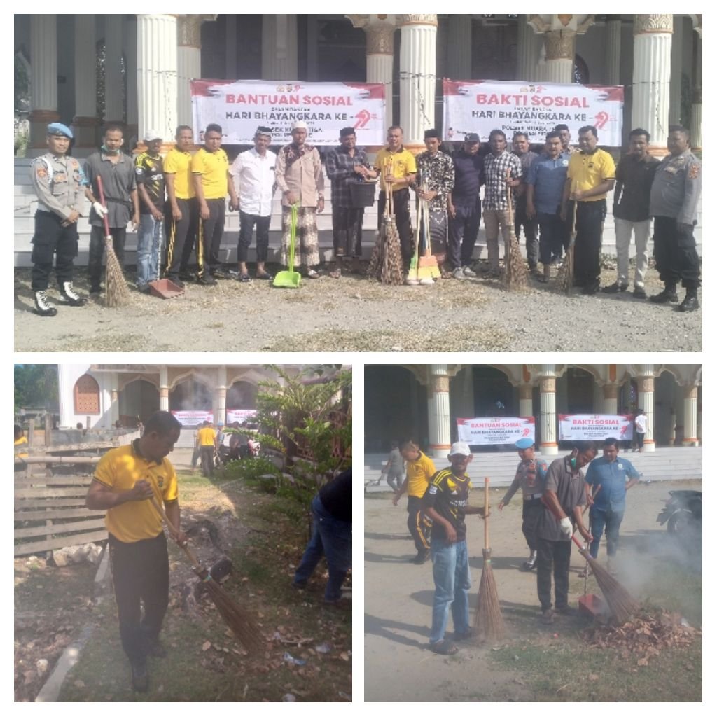 Sigli- Dalam rangka menyambut Hari Bhayangkara ke-79, Polsek Muara Tiga Polres Pidie menggelar kegiatan bakti sosial bersama perangkap Gampong serta masyarakat Kecamatan Muara Tiga Kabupaten Pidie melakukan gotong royong bersama, Acara tersebut yang berlangsung dimesjid Baitulrahim Kecamatan Muara Tiga