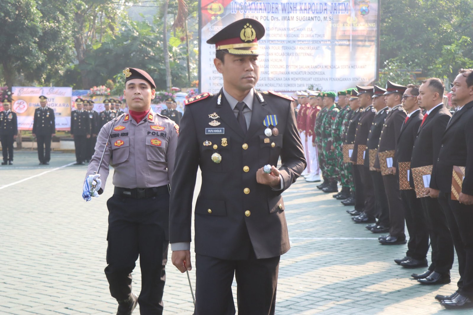 Upacara tersebut dihadiri oleh jajaran Forkopimda Kabupaten Malang, pejabat pemerintahan, tokoh agama, tokoh masyarakat, serta tamu undangan lainnya. AKBP Putu Kholis Aryana juga menyampaikan terima kasih kepada seluruh pihak, termasuk Pemerintah Kabupaten Malang, TNI, dan seluruh stakeholder, atas dukungan dan doa yang diberikan kepada Polres Malang.