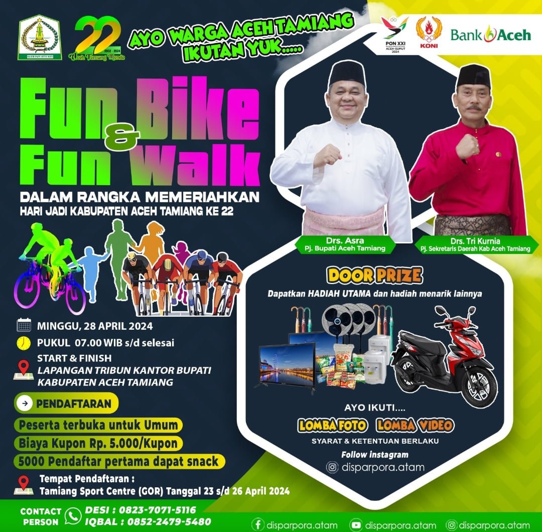Ia juga menjelaskan, untuk start dan finish kegiatan fun bike dan fun walk dari dan kembali ke lapangan kantor bupati. Selain itu, untuk pendaftaran peserta dimulai pada tanggal 23-26 April 2024 di Tamiang Sport Centre (GOR) atau dapat dilakukan melalui contact person, ke nomor 0823-7071-5116 atas nama Desi dan 0852-2479-5480 atas nama Iqbal.
