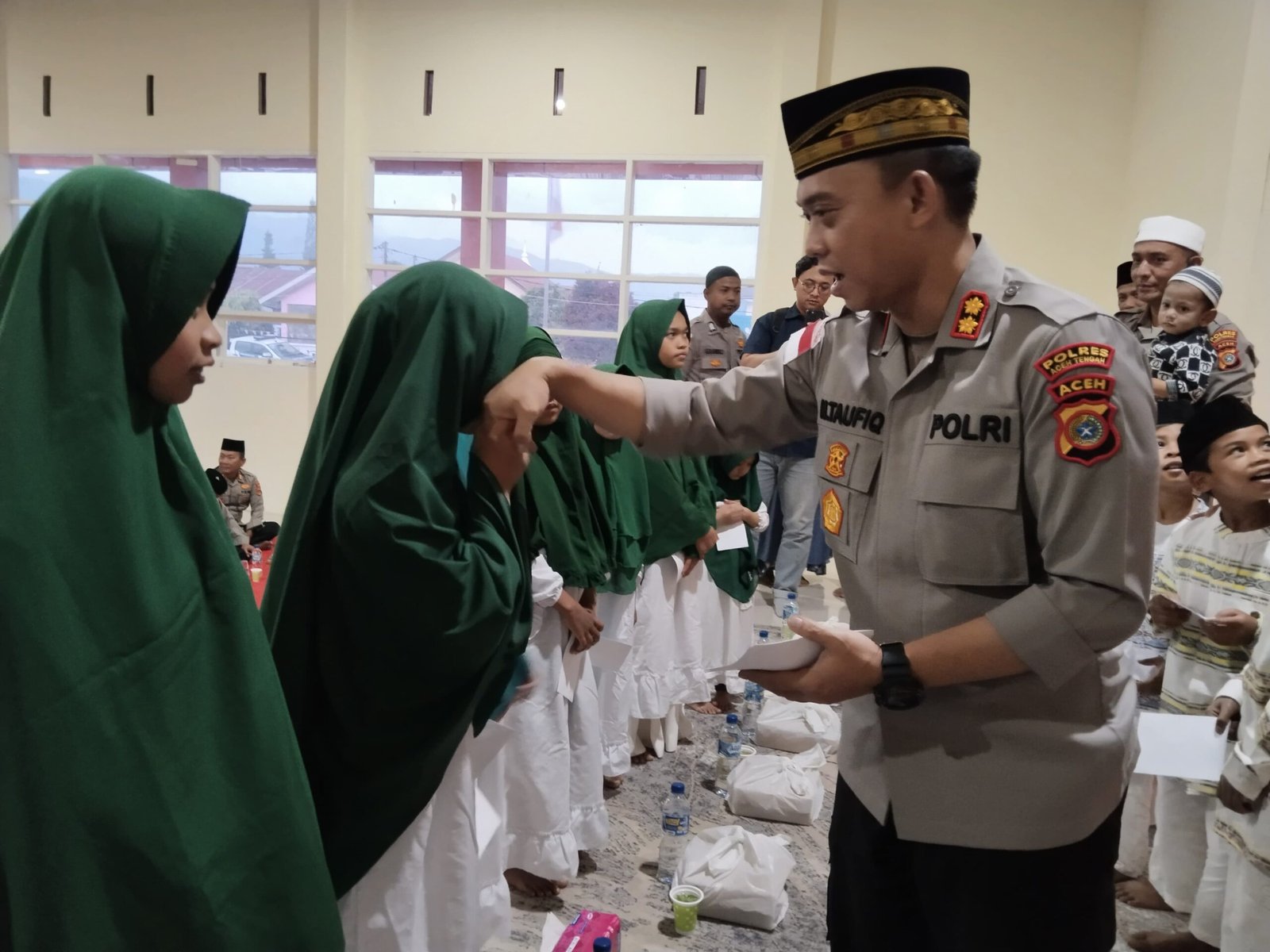 Setelah tausyiah, kegiatan dilanjutkan dengan penyerahan santunan kepada anak-anak yatim/piatu dari Yayasan Kasih Ibu sebagai bentuk kepedulian sosial Polres Aceh Tengah kepada sesama, khususnya di bulan suci Ramadhan.