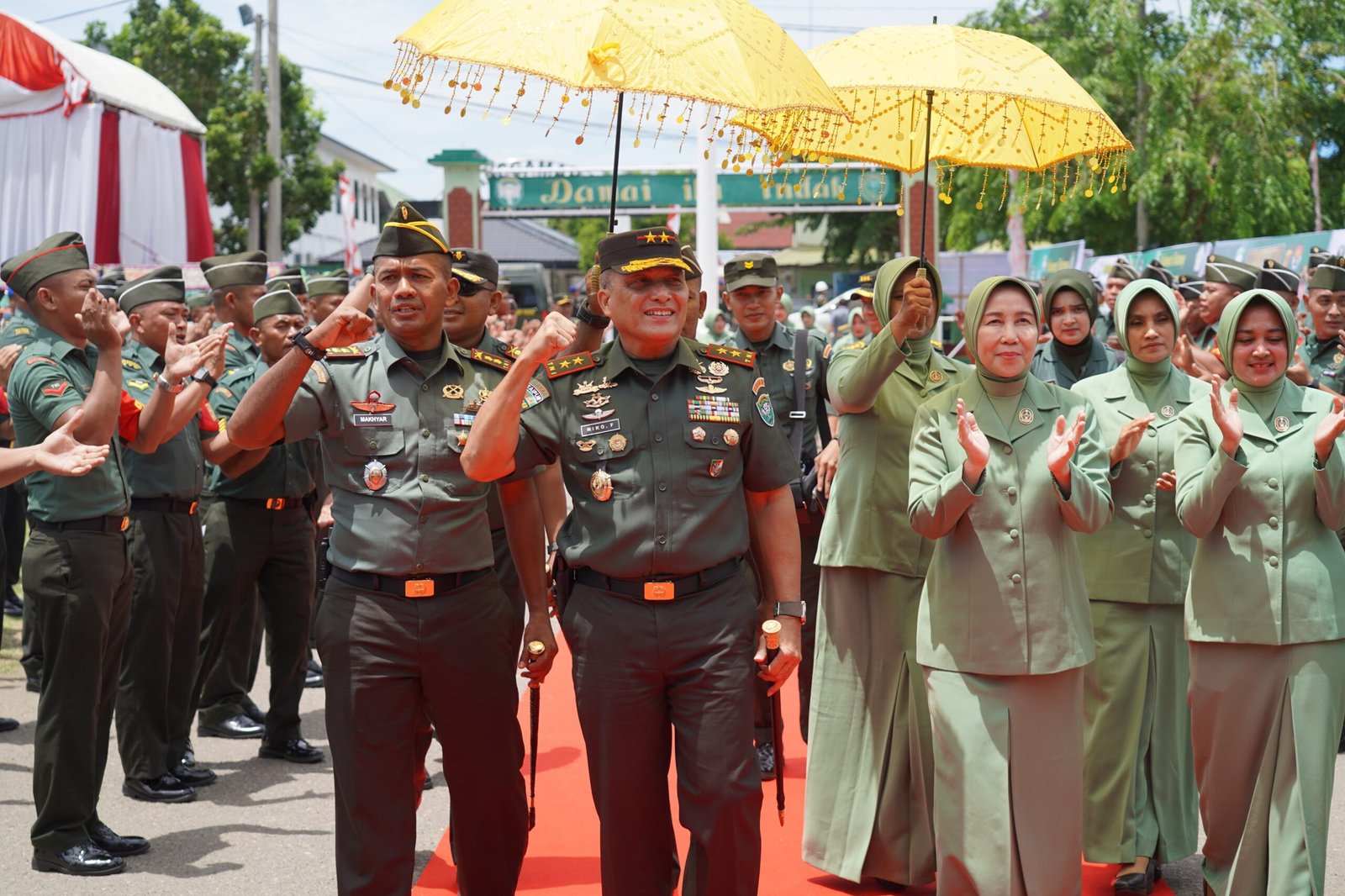 Lhokseumawe-satupena.co.id: Panglima Komando Daerah Militer Iskandar Muda (Pangdam IM), Mayor Jenderal TNI Niko Fahrizal, M.Tr (Han), didampingi Ketua Persit KCK Daerah Iskandar Muda, Ny. Eva Niko Fahrizal, melaksanakan kunjungan kerja di Makodim 0103/Aceh Utara yang disambut langsung oleh Dandim 0103/Aceh Utara Letkol Kav Makhyar S.T.,M.M.,M.H.I., dan Ketua Persit KCK Cabang XX Dim 0103 Ny. Raena Maidelsa Makhyar.