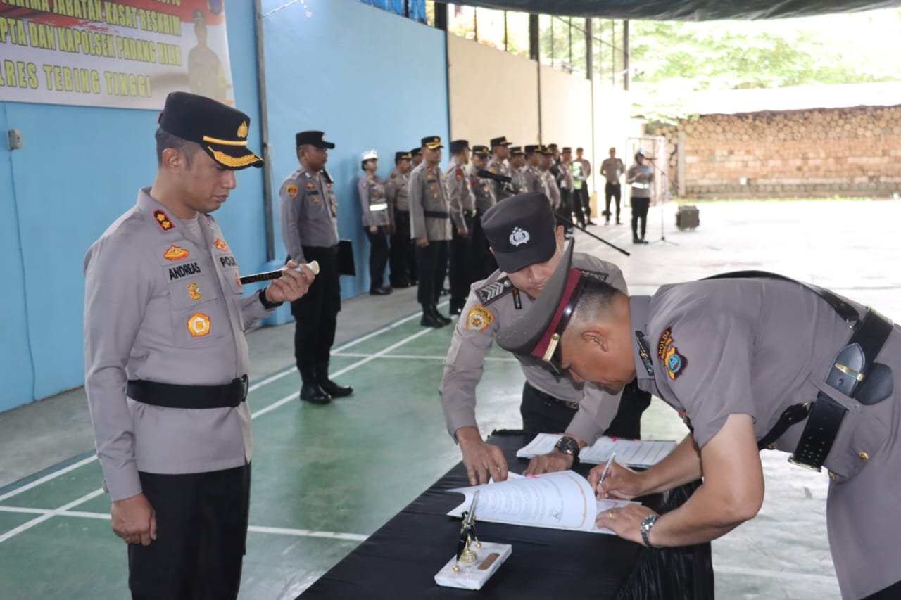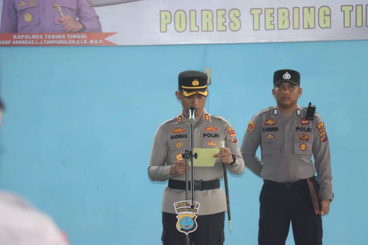 Kapolres Tebing Tinggi AKBP Andreas Tampubolon memimpin upacara serah terima jabatan (sertijab) dilingkungan Polres Tebing Tinggi, bertempat di lapangan Multifungsi Polres Tebing Tinggi, Rabu (10/07/24).
