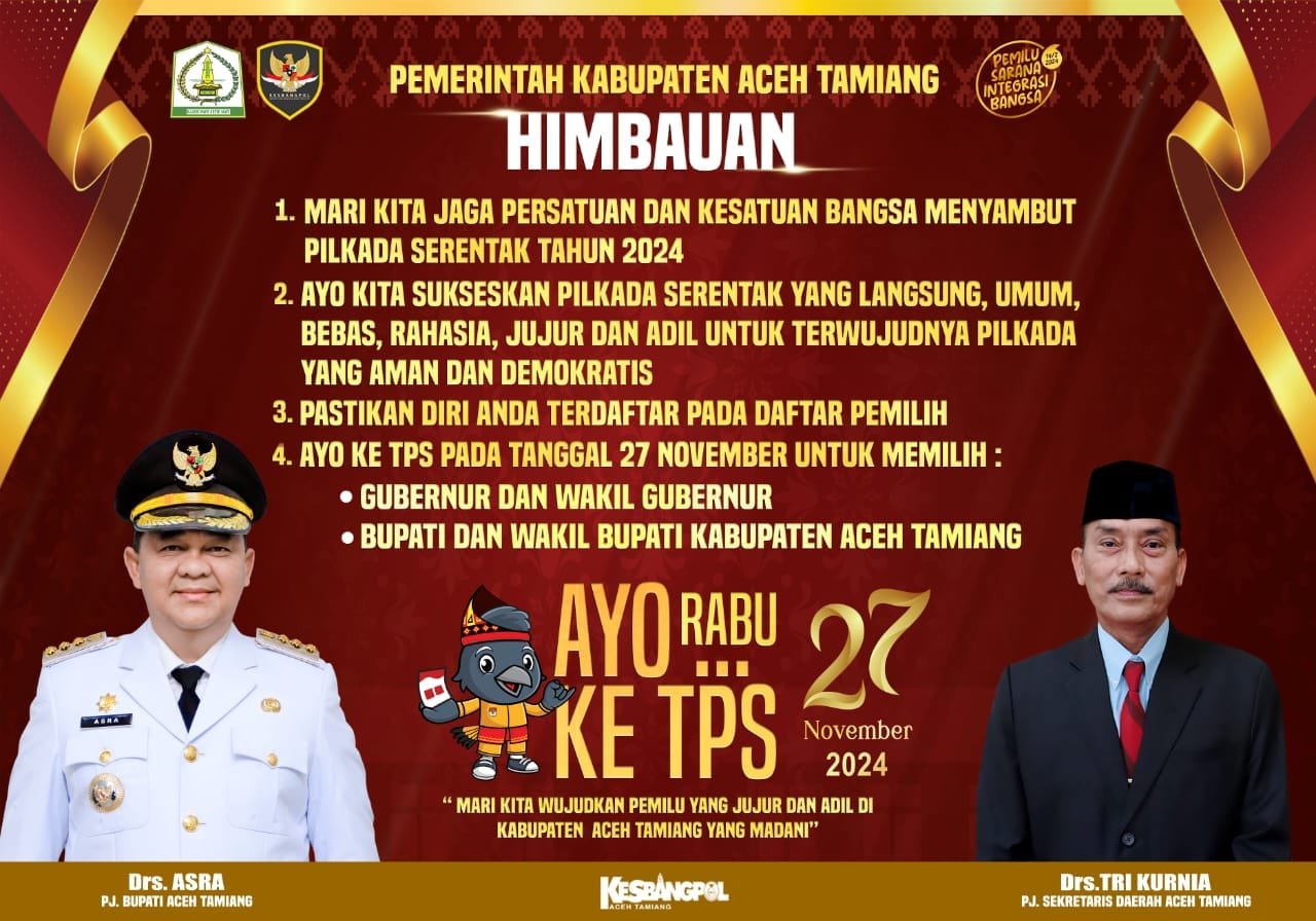 4. Ayo ke TPS pada tanggal 27 November untuk memilih gubernur dan wakil gubernur, upati dan wakil bupati Kabupaten Aceh Tamiang.