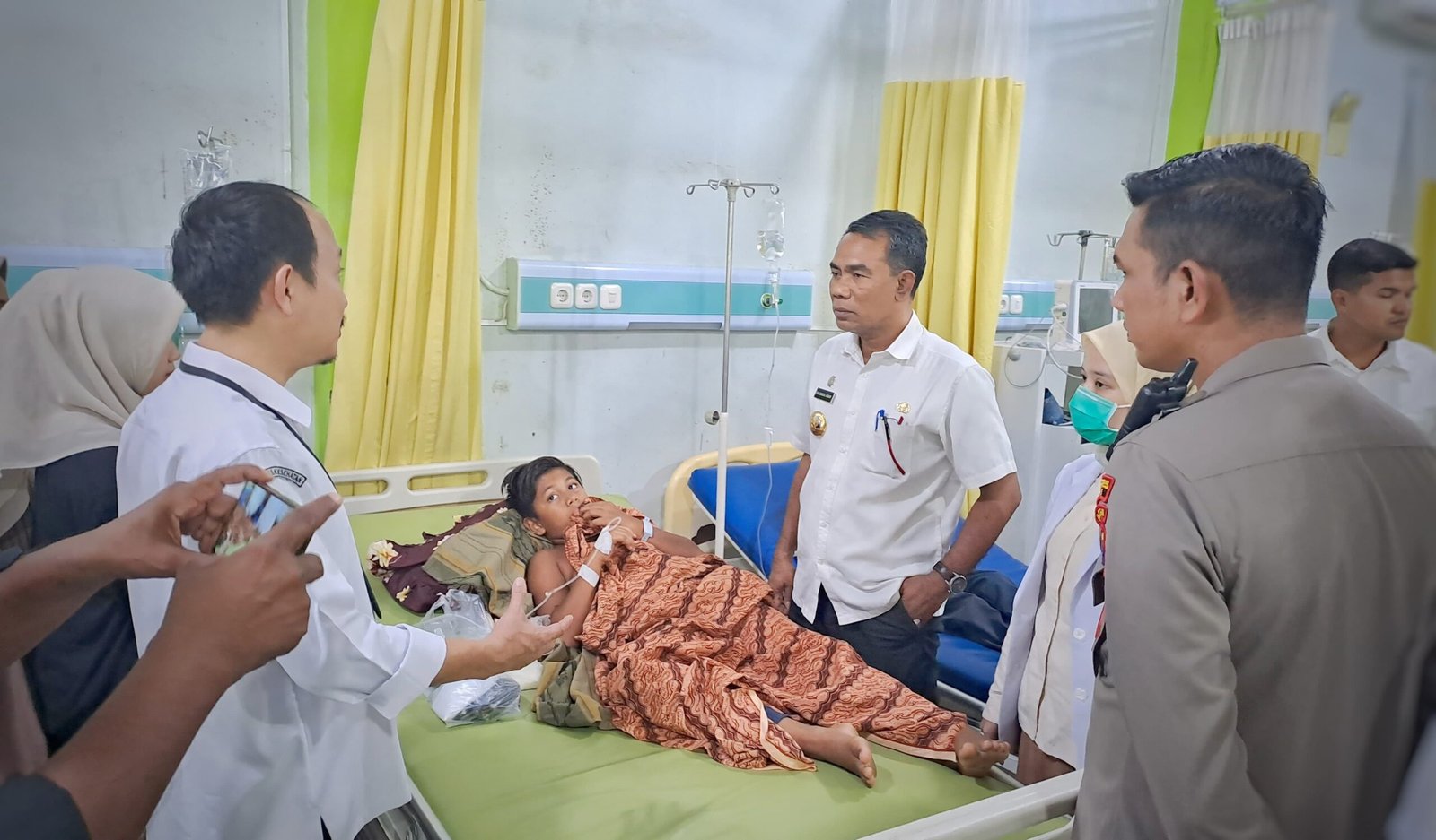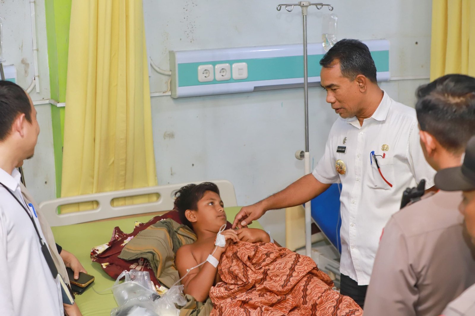 Penjabat (Pj) Bupati Pidie Drs Samsul Azhar Didampingi Plt Kepala Dinas Kesehatan (Dinkes) Pidie dr Muhammad Dwi Wijaya Sp.B, menyambangi sejumlah siswa MTsN swasta Kecamatan Tiro yang sedang di rawat di ruang Instalasi Gawat Darurat (IGD) Rumah Sakit Umum Daerah (RSUD) Tgk Abdullah Syafi’i Beureunun.