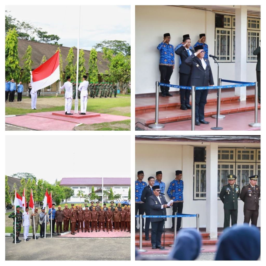 Penjabat (Pj) Bupati Pidie Ir. Wahyudi Adisiswanto, M.Si memimpin upacara peringatan Hari Lahir Pancasila Tahun 2024 berlangsung di Lapangan Tengah Kantor Bupati Pidie, Sigli, Sabtu (01/06/2024).