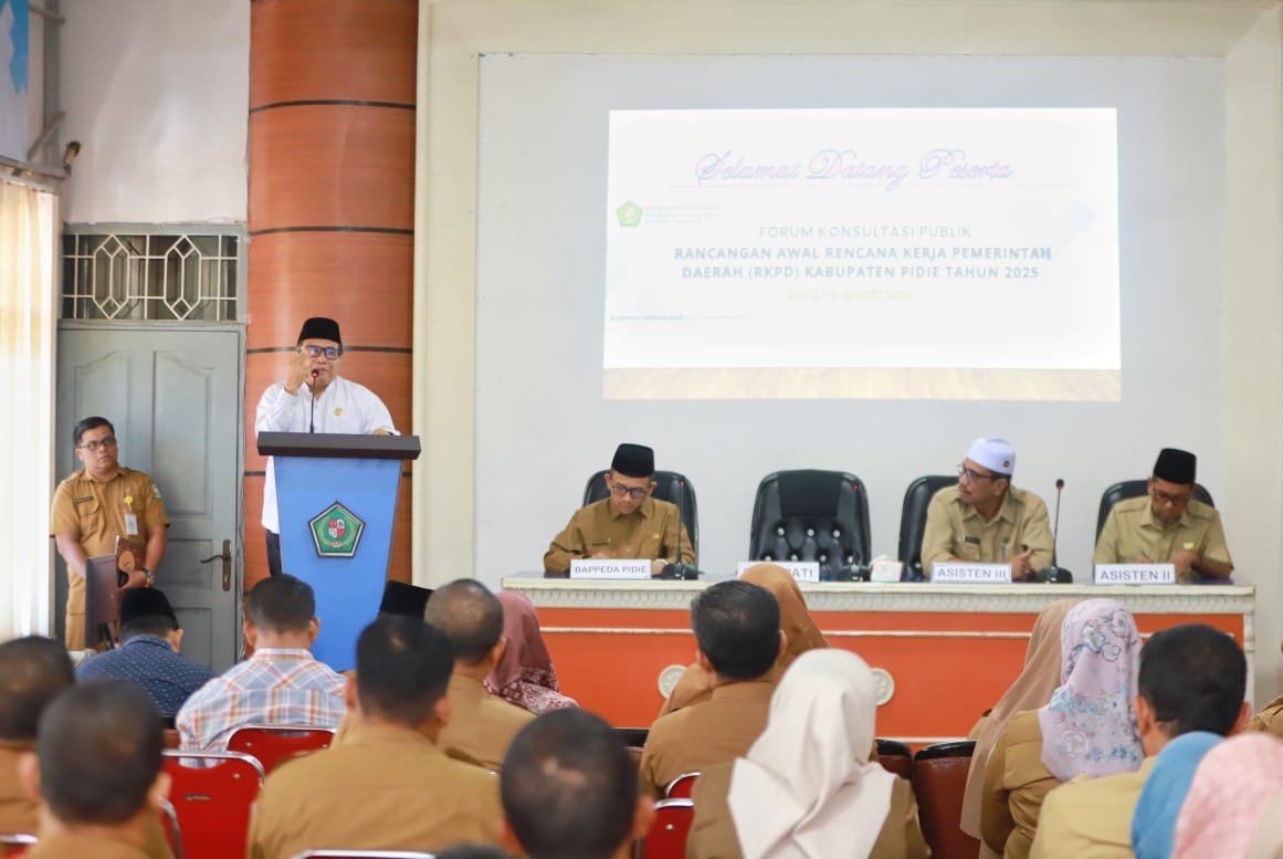 Pj Bupati Pidie dalam sambutannya meminta agar pada konsultasi publik dalam rangka Penyusunan Rancangan Awal RKPD Pidie Tahun 2025 ini agar bisa menganalisis apa saja yang menjadi kekuatan, kelemahan , ancaman serta peluang-peluang yang ada di Kabupaten Pidie. Hal tersebut ia sampaikan dengan maksud nantinya Pemerintah Kabupaten Pidie memiliki acuan jelas berbentuk inovasi yang berbeda dengan daerah-daerah lain yang ada di Provinsi Aceh.