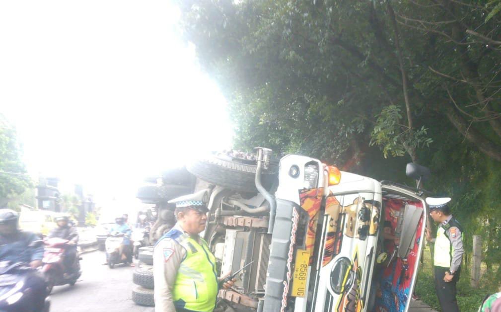 Selanjutnya truk berwarna putih itu kehilangan kendali dan terguling ke sisi kiri. Akibatnya truk melintang menghalangi hampir separuh badan jalan.