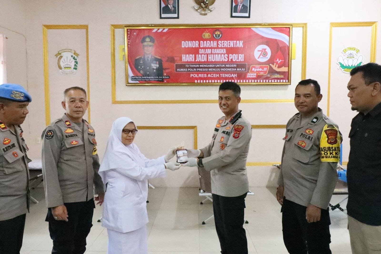 Menyambut Hari jadi Humas Polri ke 73 Tahun 2024 Polres Aceh Tengah gelar Bakti Sosial Donor Darah yang dilaksanakan di Aula Polres Aceh Tengah, Selasa 29 Oktober 2024.