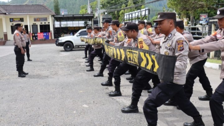Ratusan personel Polres Aceh Tengah digenjot kemampuan taktisnya melalui latihan Pengendalian Massa (Dalmas) di Lapangan Apel Mapolres, Kamis (18/9/2025).