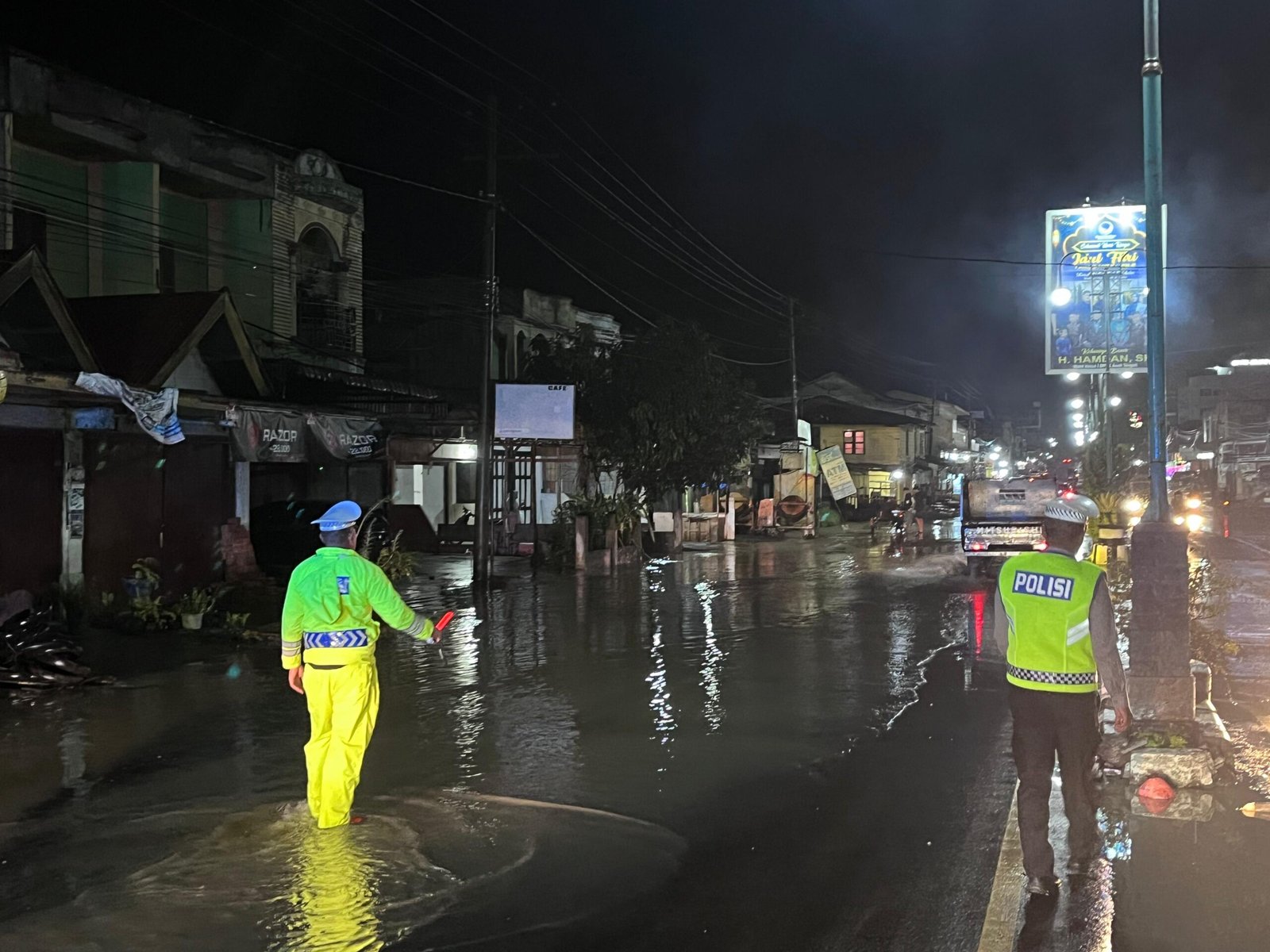 Kegiatan yang dimulai sekitar pukul 19.30 WIB ini difokuskan pada ruas jalan yang tergenang air akibat tingginya curah hujan. Kondisi tersebut berpotensi menimbulkan kemacetan serta meningkatkan risiko kecelakaan lalu lintas.