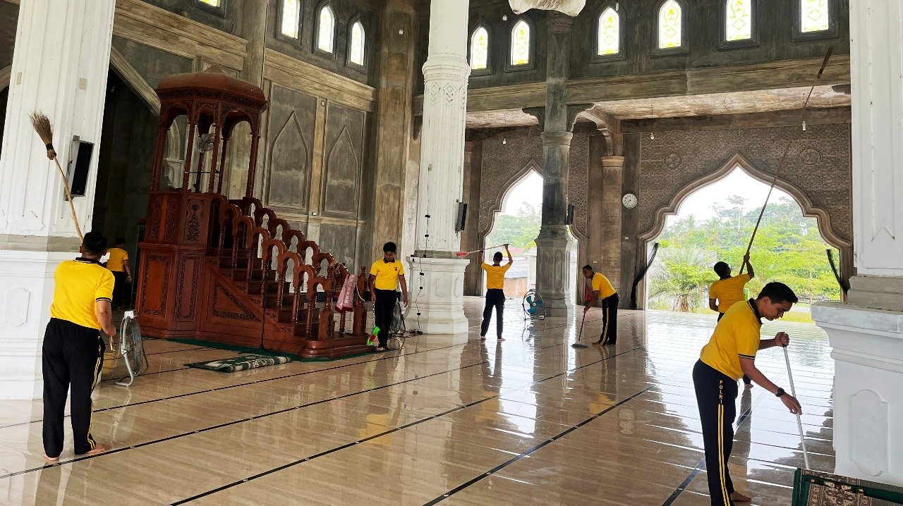 Kegiatan yang dimulai setelah pelaksanaan apel pagi ini diikuti oleh seluruh personel dengan penuh semangat. Dengan bergotong royong, para personel membersihkan halaman masjid, mencabut rumput yang mulai meninggi, menyapu area perkarangan, hingga membersihkan kamar mandi serta tempat wudhu yang menjadi fasilitas penting bagi jamaah.