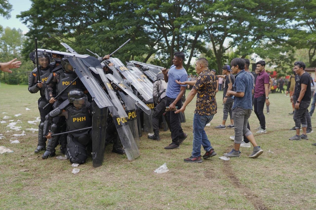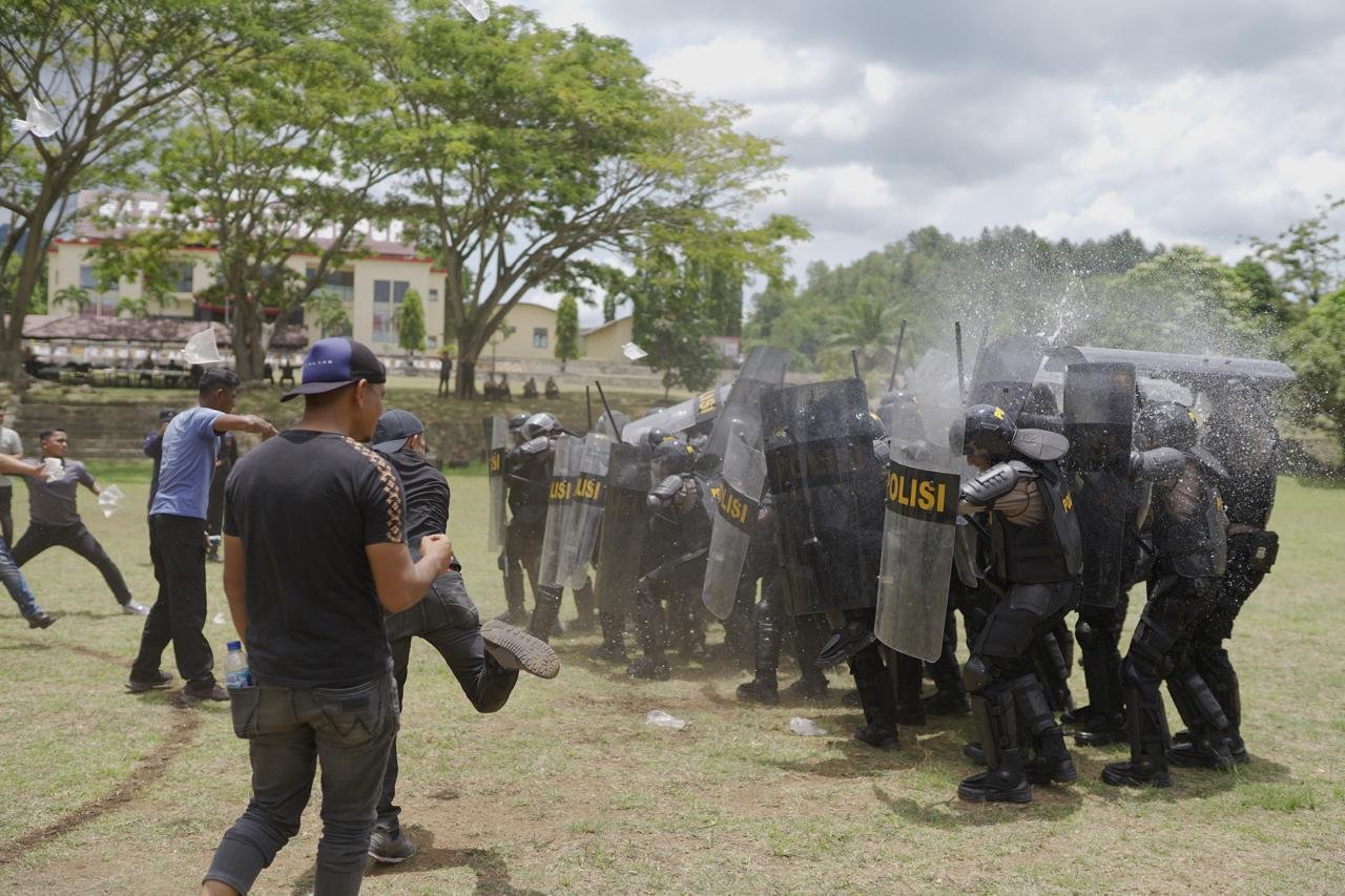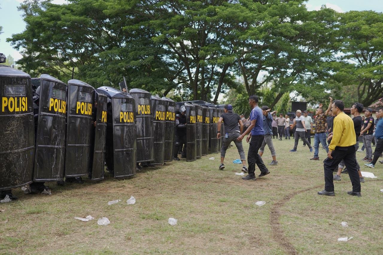 Personel Polres Pidie dan Personel Pelopor Batalyon A Sat Brimob Polda Aceh melaksanakan latihan bersama dalam kegiatan simulasi sistem pengamanan kota (sispamkota) Ops Mantap Praja Seulawah Tahun 2024 di lapangan Batalyon A Sat Brimob Polda Aceh – Seulawah Kabupaten Aceh Besar, Kamis (22/08/2024)