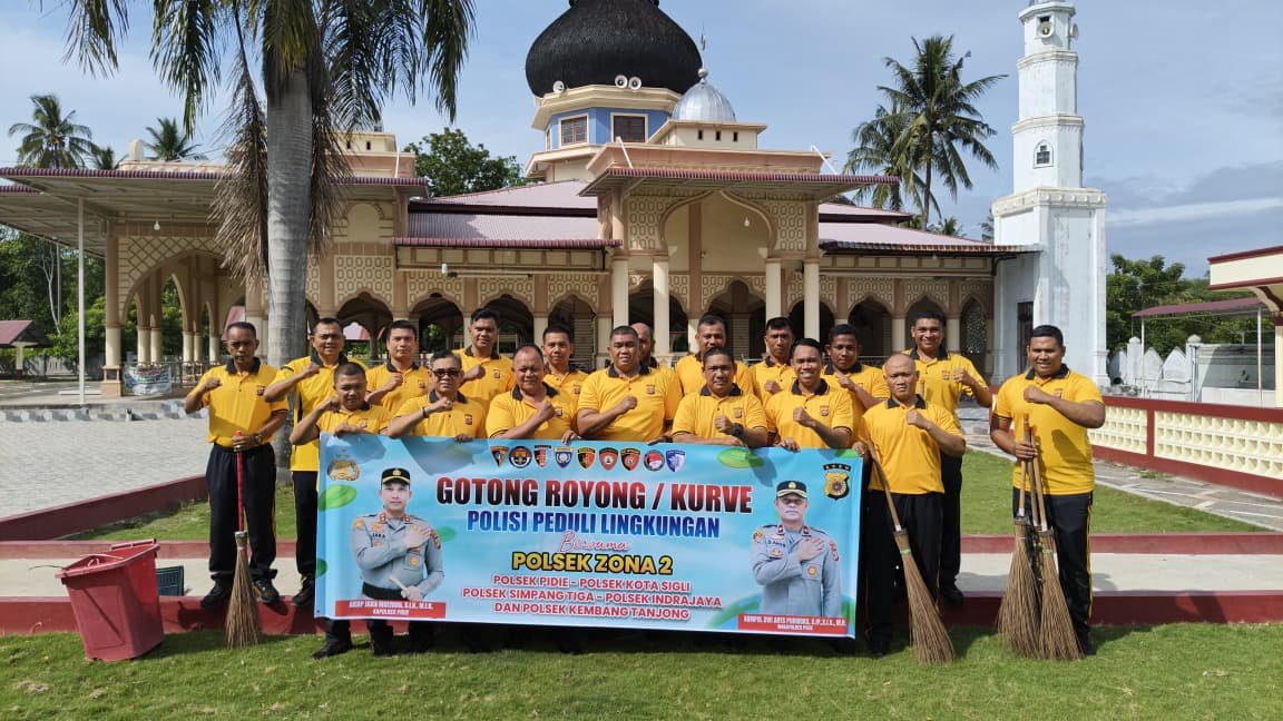 Sigli – Polres Pidie melaksanakan kegiatan gotong royong atau kurve di Masjid Jamik At-Taqwa, Gampong Bunien, Kecamatan Simpang Tiga, Kabupaten Pidie, pada Minggu (14/9/2025).