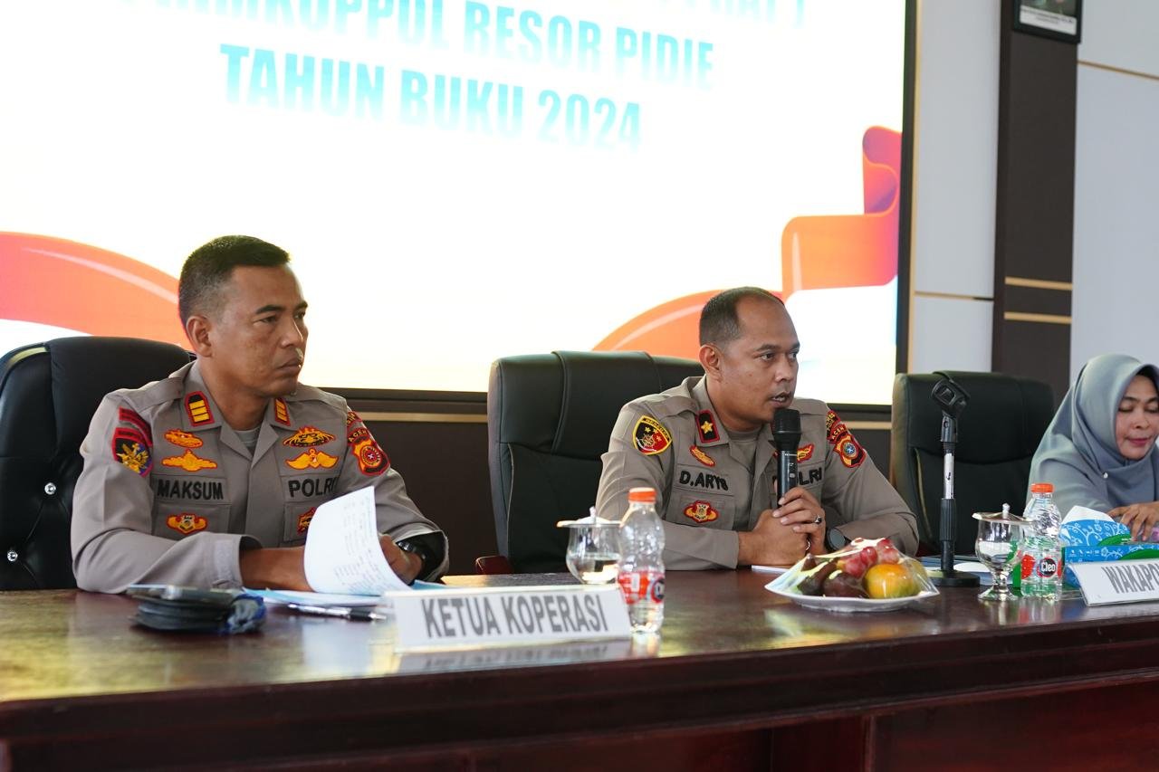 Dalam kegiatan RAT tutup buku Tahun 2024, Wakapolres Pidie Kompol Dwi Arys Purwoko, S.IP, SIK, MH membacakan sambutan Kapolres Pidie AKBP Jaka Mulyana, SIK , MIK bahwa kegiatan RAT itu merupakan kewajiban yang harus dilaksanakan oleh pengurus Koperasi setelah menyelesaikan tugas dan tanggung jawab pengelolaan usaha Koperasi selama setahun.