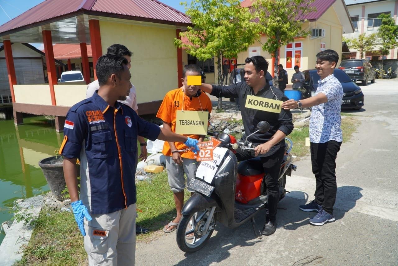 Reka ulang adegan yang seharusnya berlangsung dilokasi kejadian, yaitu di kawasan irigasi persawahan Gampong Raya Paleu Kecamatan Simpang Tiga, Kabupaten Pidie dialihkan ke lokasi parkir depan ruangan Satreskrim Polres Pidie.