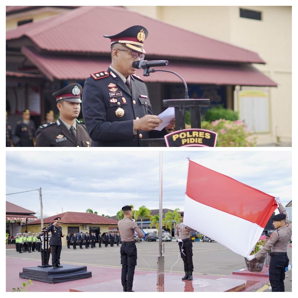 Sigli – Polres Pidie menggelar upacara memperingati Hari Lahir Pancasila tahun 2024 yang bertempat di Lapangan Apel Polres Pidie. Sabtu (1/6/2024)