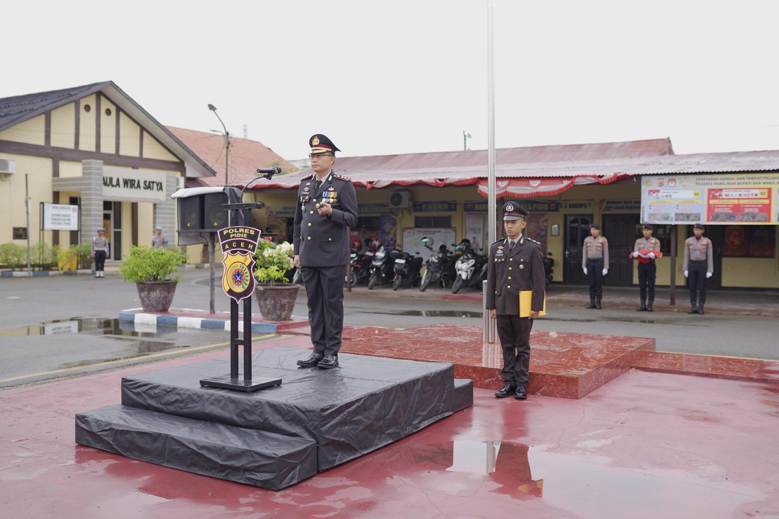 Sigli – Kapolres Pidie AKBP Jaka Mulyana, SIK, MIK, bertindak selaku inspektur upacara pada peringatan Hari Pahlawan di lapangan apel Mapolres setempat, Minggu (10/11/2024).
