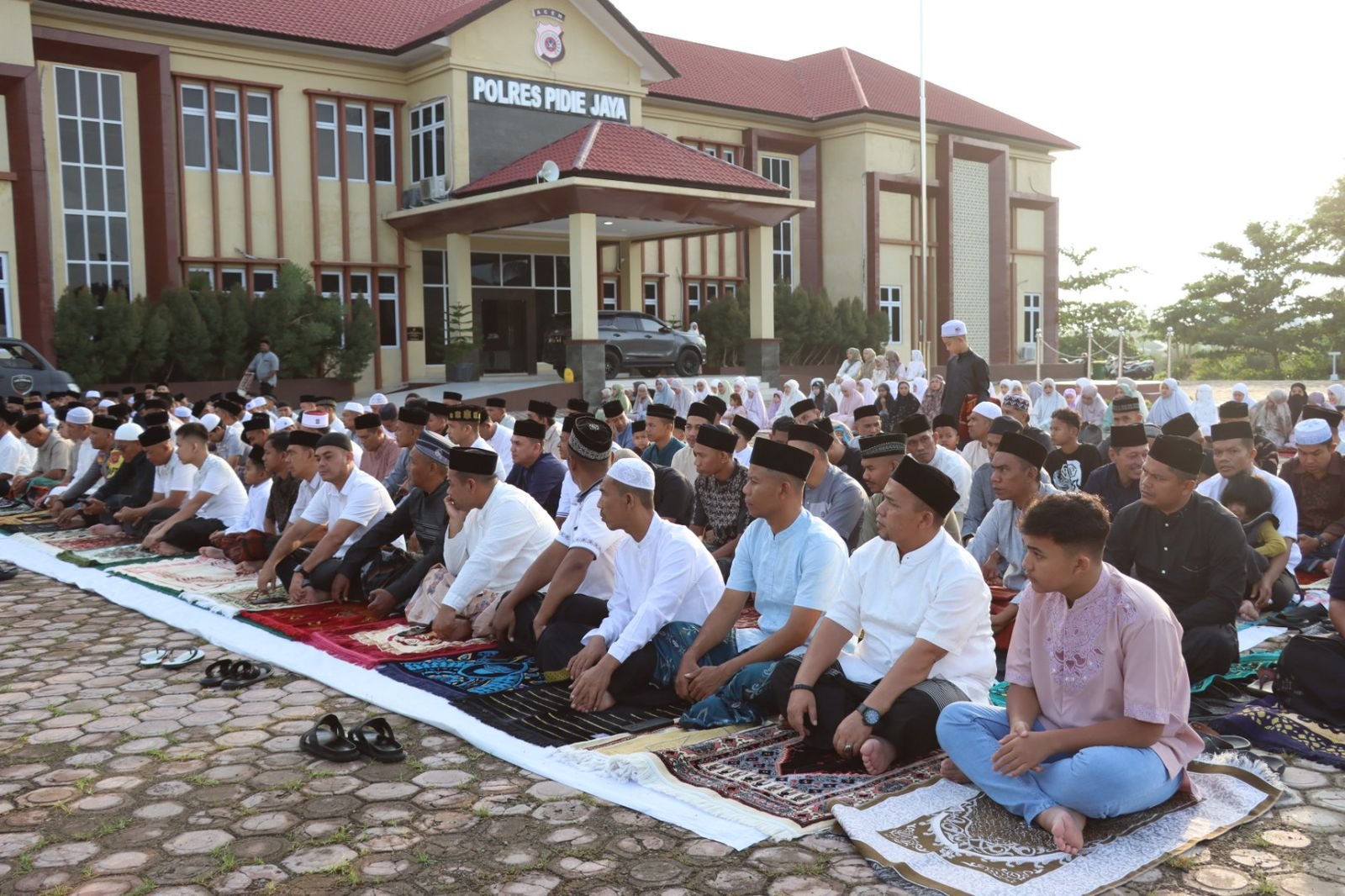 Kapolres Pidie Jaya AKBP Ahmad Faisal Pasaribu, S.H., S.I.K., M.H., melalui Kasi Humas Ipda Mustafa, menyampaikan bahwa pelaksanaan Sholat Idul Fitri di lingkungan Polres Pidie Jaya merupakan wujud kebersamaan dan solidaritas dalam menjalankan ibadah.