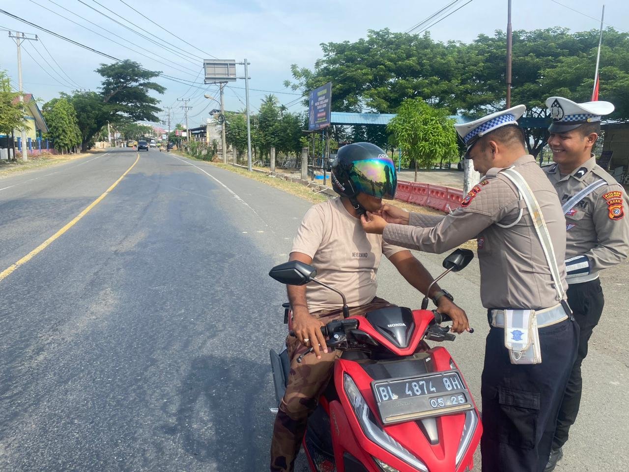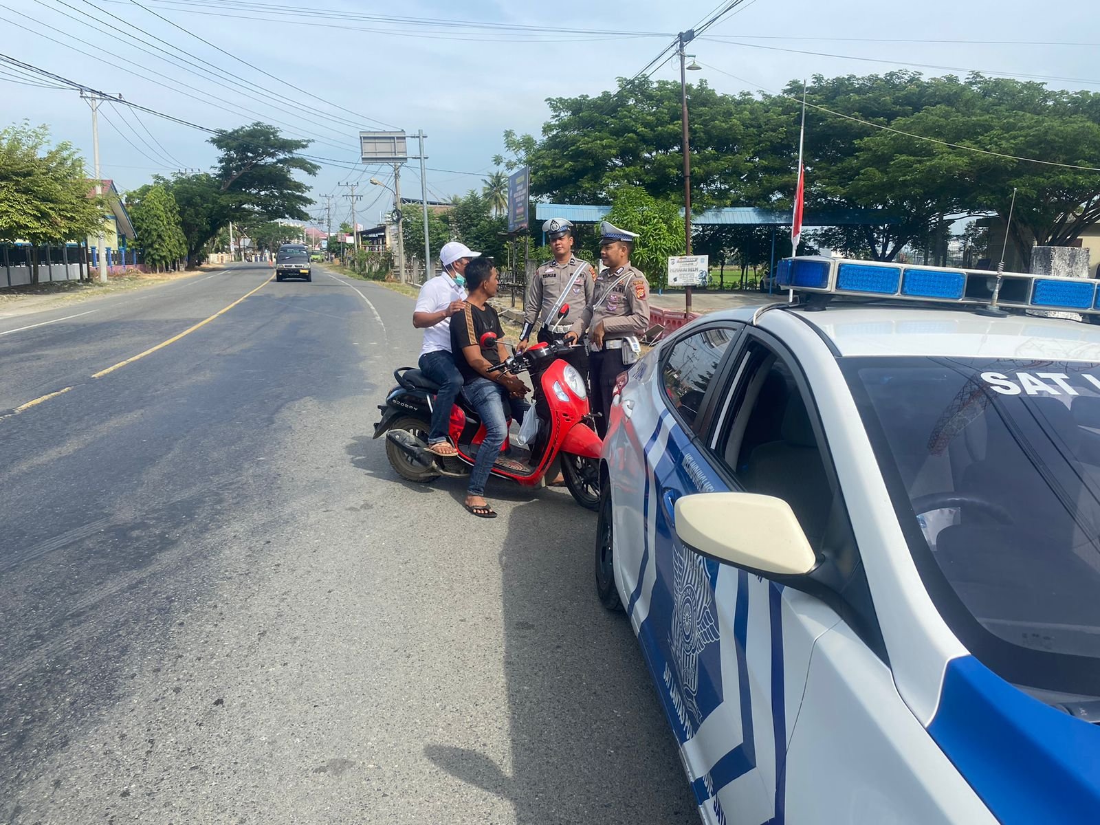Patroli ini dilakukan di Jalan Medan Banda Aceh, di mana personel Satlantas Polres Pidie Jaya memberikan teguran kepada pengendara sepeda motor yang melanggar aturan lalu lintas.