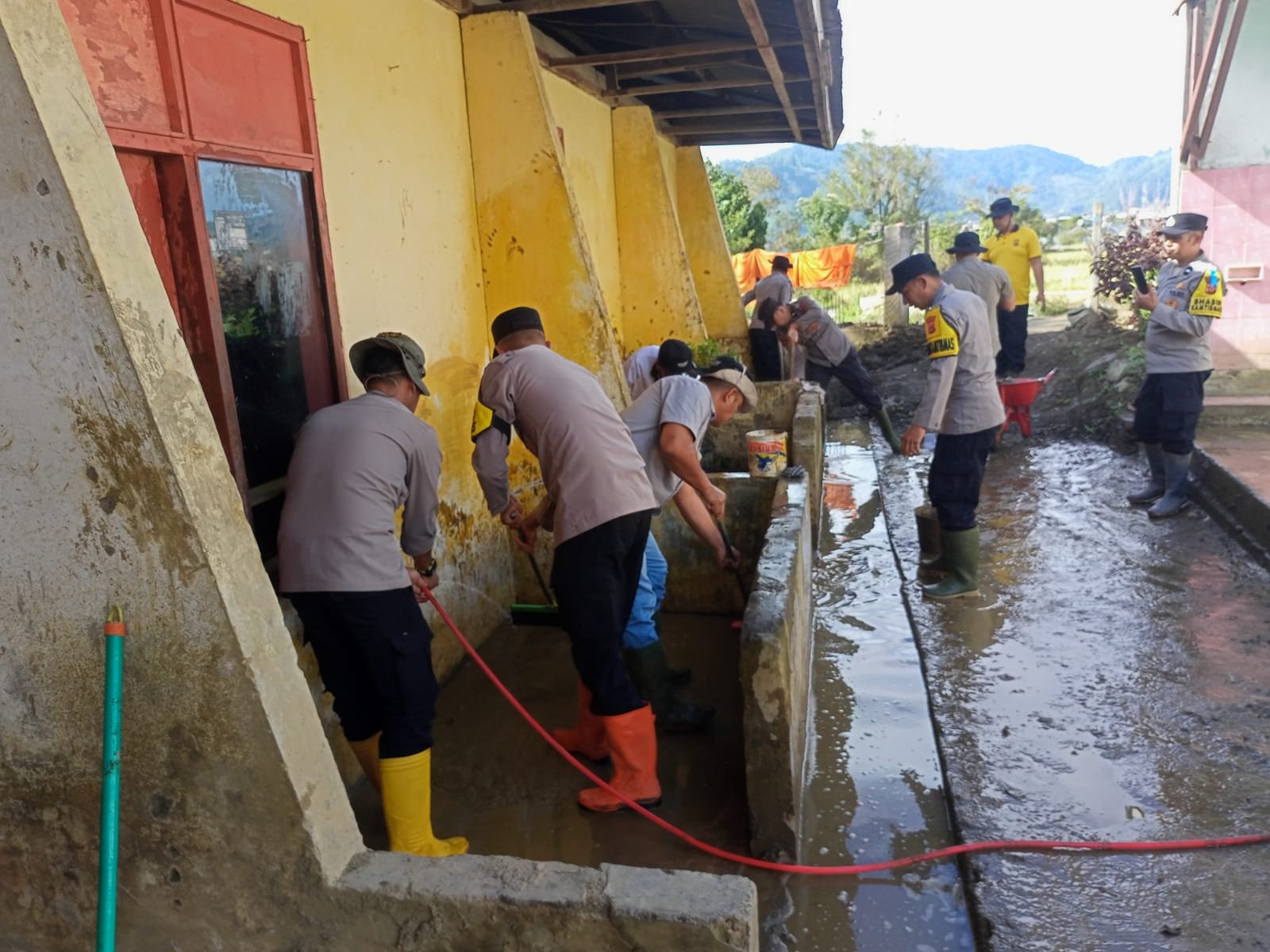 Di lokasi, personel bersama mahasiswa dan pihak sekolah bekerja bahu membahu menyapu dan membersihkan pekarangan, mengangkat serta menyingkirkan tanah dan lumpur yang menutupi area bangunan, membersihkan saluran air, serta membuat pemaritan agar aliran air menjadi lancar.