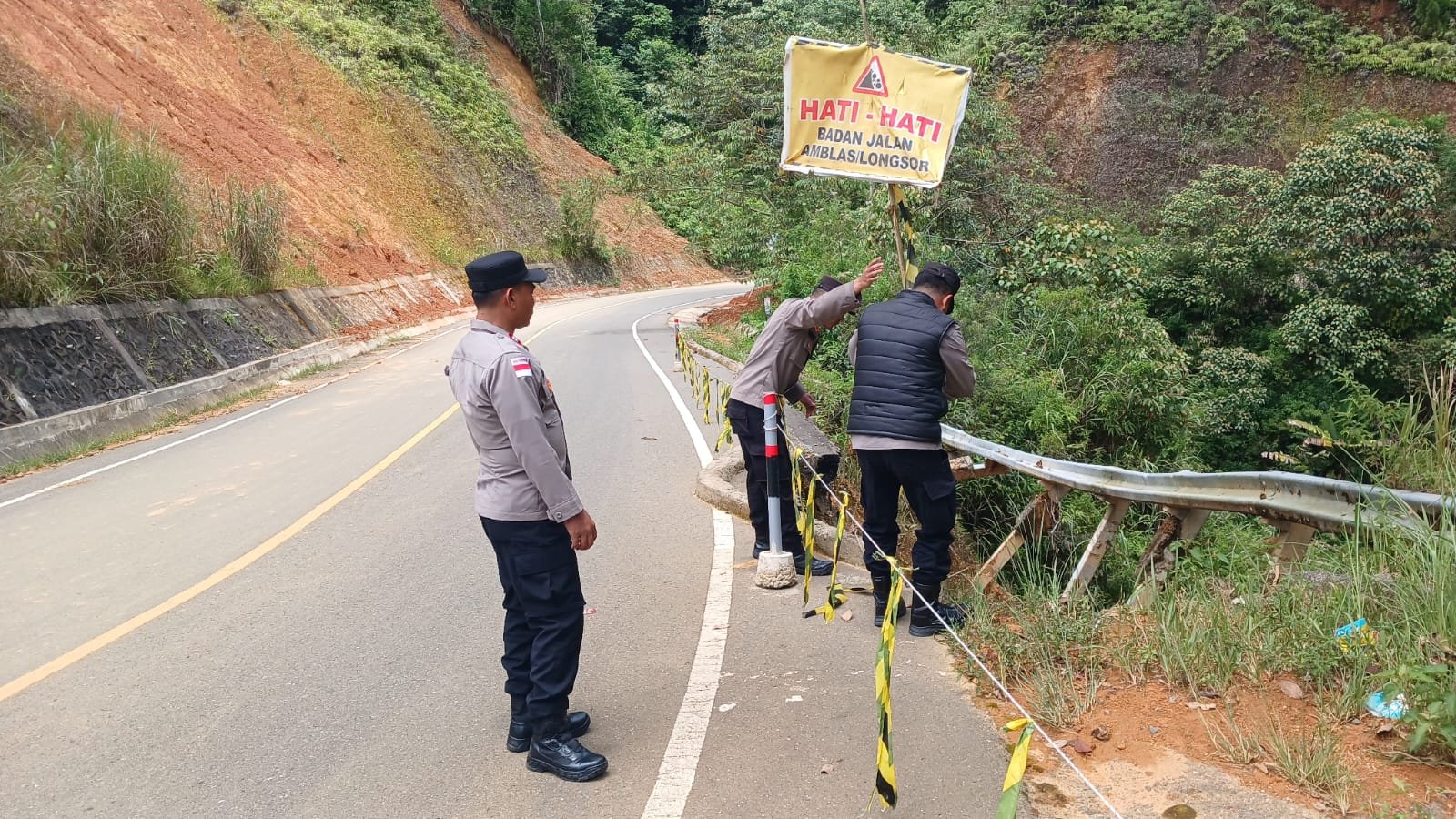 Petugas menemukan lokasi jalan amblas dan titik rawan longsor yang berpotensi membahayakan pengguna jalan. Sebagai langkah antisipasi, personel memasang garis polisi (police line) di area tersebut guna mencegah terjadinya kecelakaan lalu lintas.