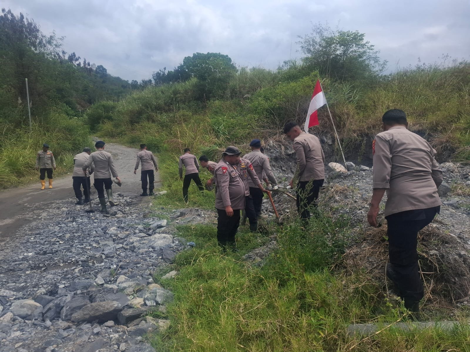 Kegiatan ini bertujuan untuk membantu memulihkan akses jalan menuju permukiman warga yang terdampak longsor dan banjir bandang. Kehadiran personel Polri di lokasi diharapkan dapat mempercepat pemulihan aktivitas masyarakat sekaligus mempererat hubungan silaturahmi antara Polri dan warga,” ujar Iptu Samsul.