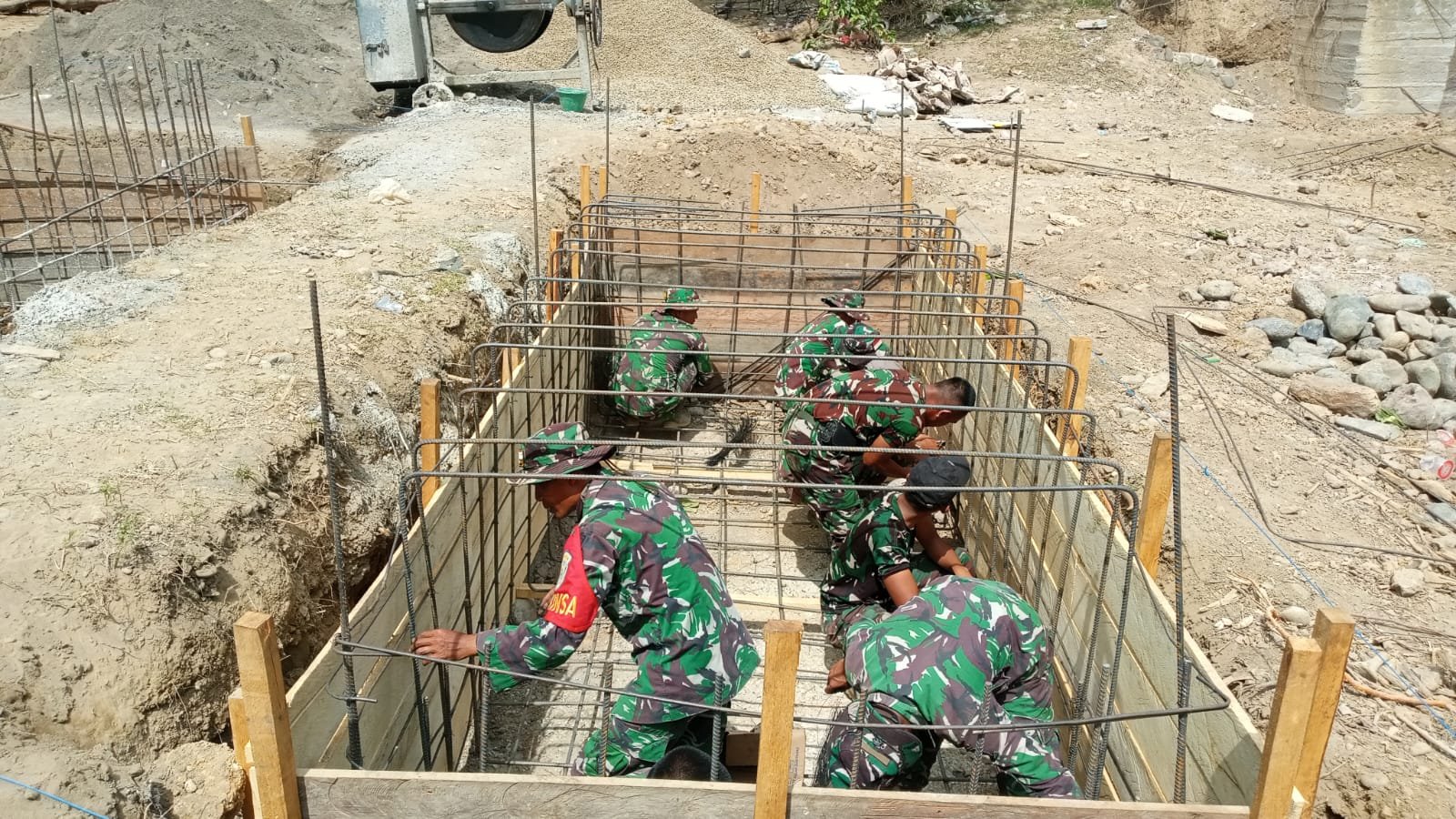 Adapun kegiatan yang telah dilaksanakan meliputi pelangsiran material ke titik pekerjaan kedua, perakitan besi abutment, serta perakitan dan pembengkokan besi oleh personel TNI bersama masyarakat.