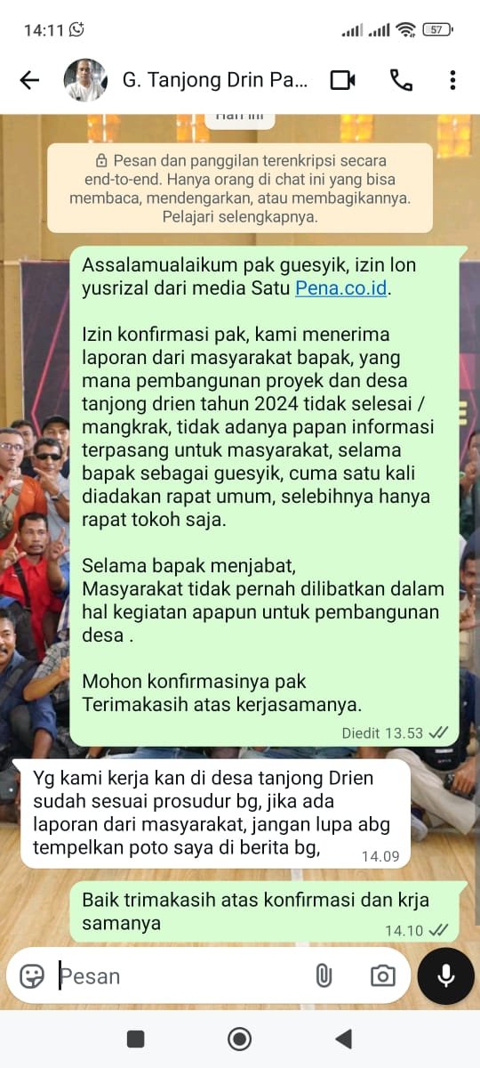 “Yang kami kerjakan di Desa Tanjong Drien sudah sesuai prosedur, Bang. Kalau ada laporan dari masyarakat, jangan lupa abang tempel foto saya di berita,” tulisnya dengan nada menantang.