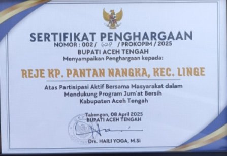 penghargaan Gotong Royong Jum’at bersih paling rutin setiap hari Jum’at pagi Gotong Royong Se- kabupaten Aceh Tengah,