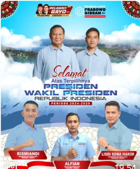 Untuk itu kami selaku penasehat Relawan Prabowo – Gibtan mengucapkan ribuan terimaksih kepada 96 juta lebih rakyat indonesia dan khusnya aceh tengah, saatnya kita kembali bergandengan tangan, bahu membahu untuk membangun negri tercinta ini kearah yang lebih gemilang lagi.
