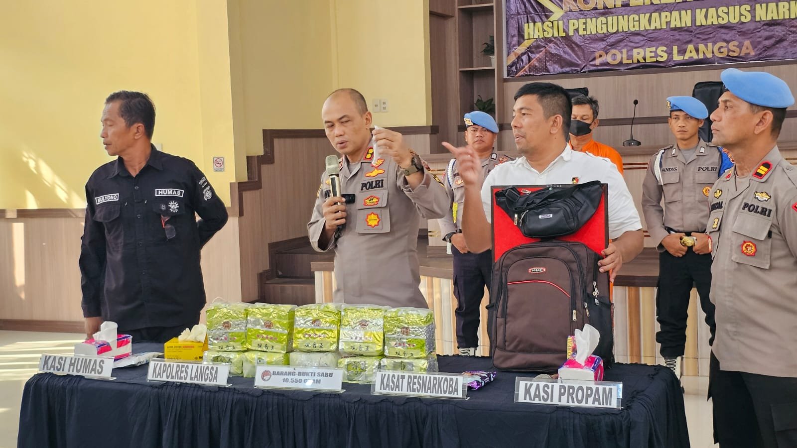 Dari hasil penangkapan itu, Unit Opsnal Sat Resnarkoba Polres Langsa berhasil mengamankan barang bukti 10 paket besar sabu dengan berat keseluruhan 10.550 gram, 1 tas ransel coklat, 1 tas selempang hitam, 3 handphone dan