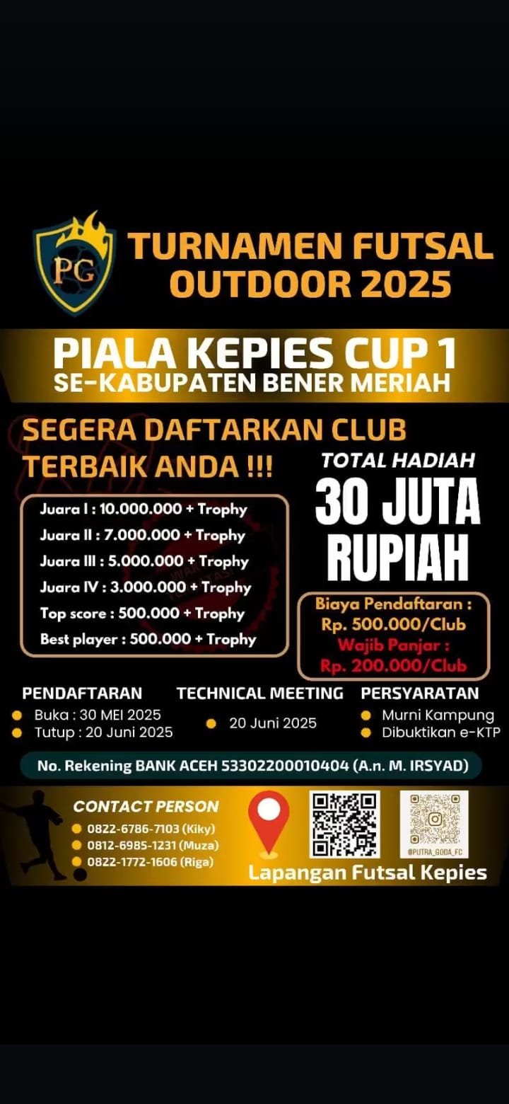 Bener Meriah, Satupena.co.id, – Kabar gembira untuk seluruh pecinta futsal di Kabupaten Bener Meriah! Turnamen futsal outdoor paling dinantikan tahun ini, “Piala Kepies Cup 1”, resmi membuka pendaftaran! Ayo buktikan bahwa klub Anda adalah yang terbaik, dan rebut total hadiah senilai Rp 30 juta rupiah plus piala kehormatan dan gelar prestisius!