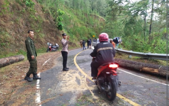 Sekira pukul 16.10 Wib,Polsek Linge Polres Aceh Tengah laksanakan pembersihan Penanganan material pohon kayu tumbang akibat Bencana alam angin kencang disertai hujan,