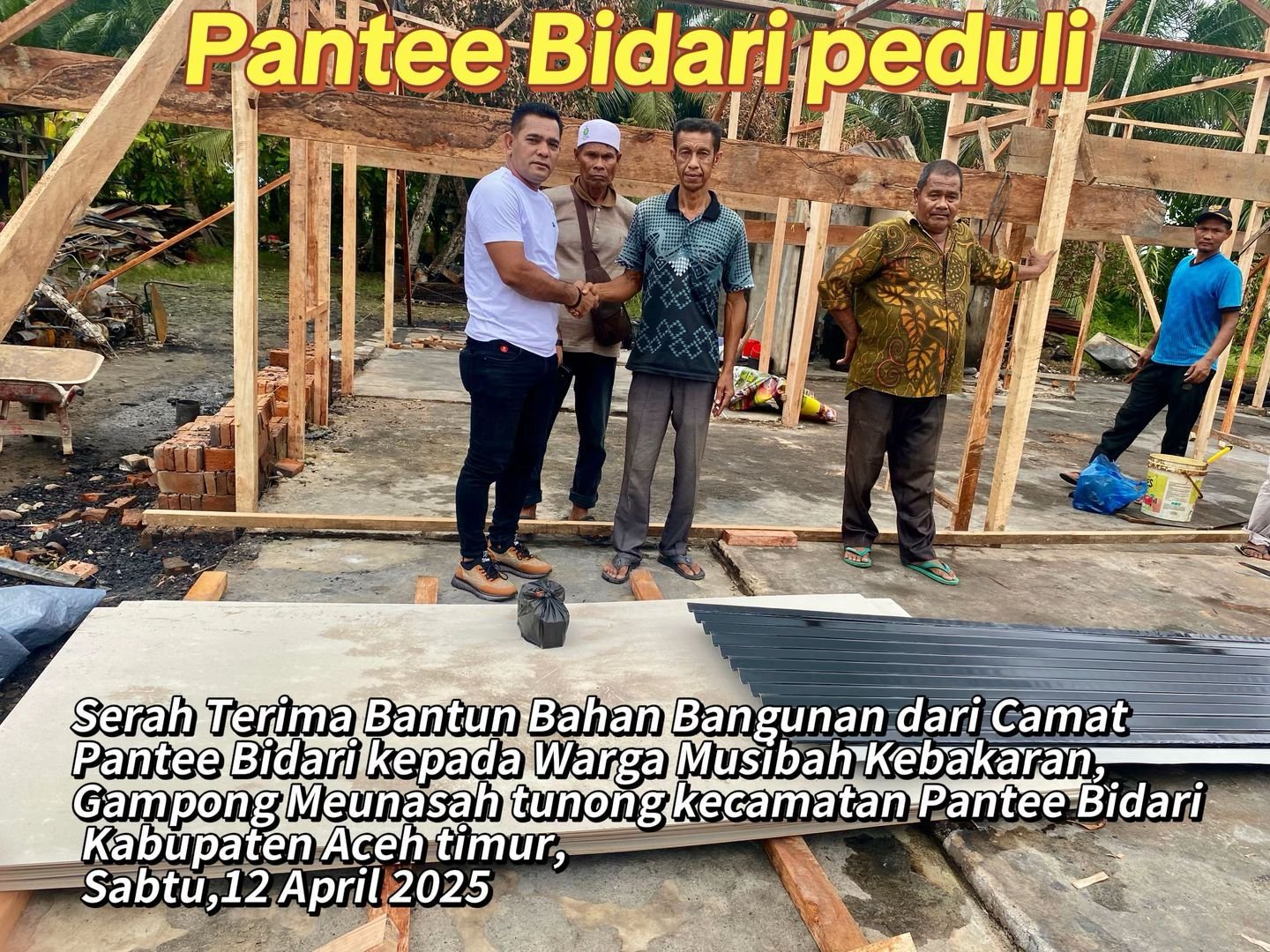 Aceh Timur, Satupena.co.id.– Kepedulian dan kepemimpinan responsif kembali ditunjukkan oleh Pemerintah Kecamatan Pantee Bidari. Musibah kebakaran yang menghanguskan rumah milik Hasbi (75), warga Gampong Meunasah Tunong, pada Selasa sore, 8 April 2025, tak hanya menjadi duka bagi korban, tetapi juga membangkitkan solidaritas dan kerja sama antarpihak.