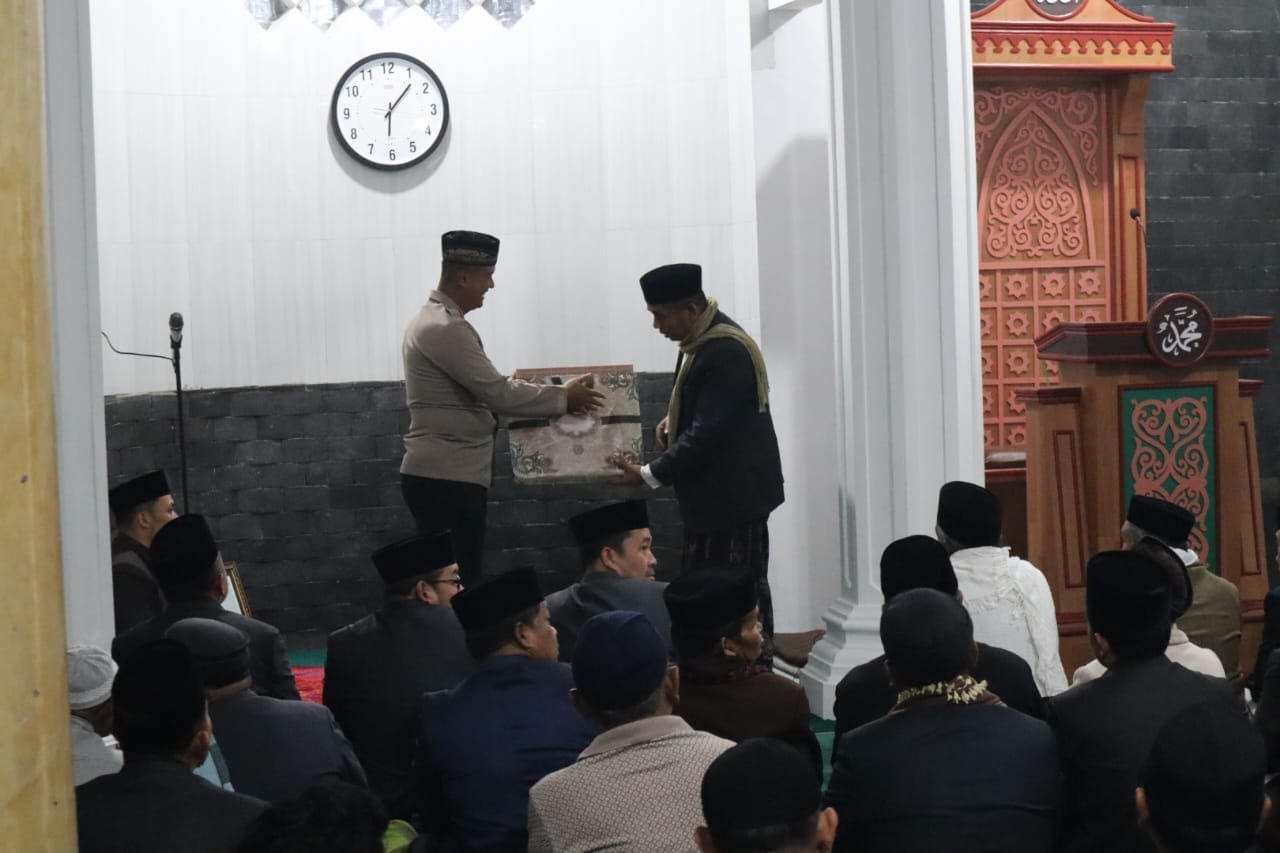 “Meningkatkan kepedulian thdp keluarga agar terhindar dan tidak terjerumus penyalahgunaan Narkoba, Pinjaman Online serta hal-hal negatif lainnya”tutup AKBP Dody, dilanjutkan pemberian cinderamata pada pengurus masjid.