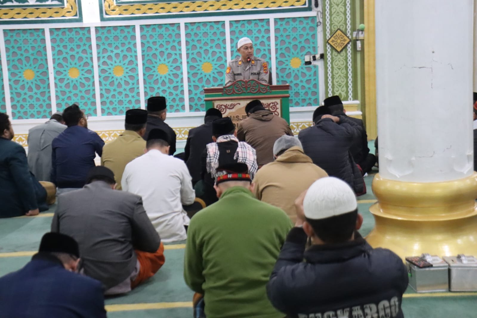 Kapolres Aceh Tengah AKBP Muhamad Taufiq, S.I.K., M.H., yang diwakili Kapolsek Bebesen AKP Dasril, SAB menyampaikan pesan kamtibmas dalam Safari Subuh Rabu Berkah di Masjid Ruhama, Takengon, Rabu (11/2/2026).