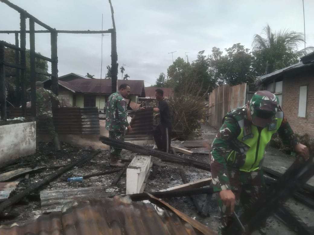 “Tampak di lokasi material kayu dan pecahan genteng yang sudah hangus terbakar diangkat dan dibersihkan oleh anggota Koramil dengan warga sekitar,”.