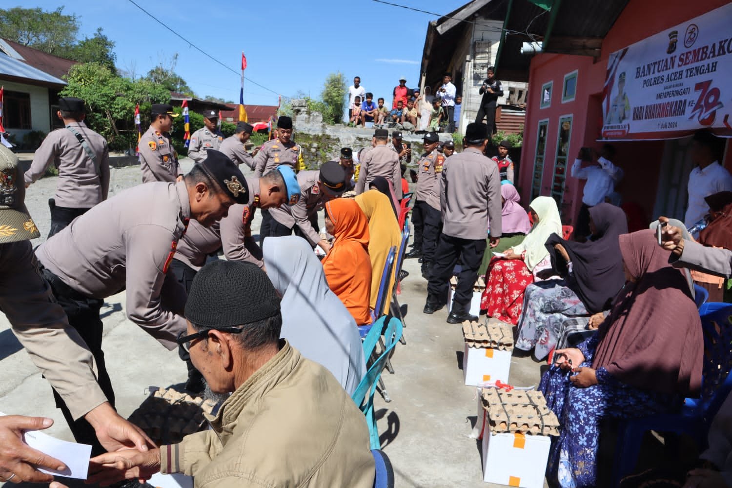 Menyambut hari jadi Bhayangkara Ke 78 tahun 2024, Kepolisian Resor Aceh Tengah, Polda Aceh, menggelar Kegiatan Bakti Sosial dengan memberikan bantuan Sosial berupa paket sembako bagi warga masyarakat yang membutuhkan