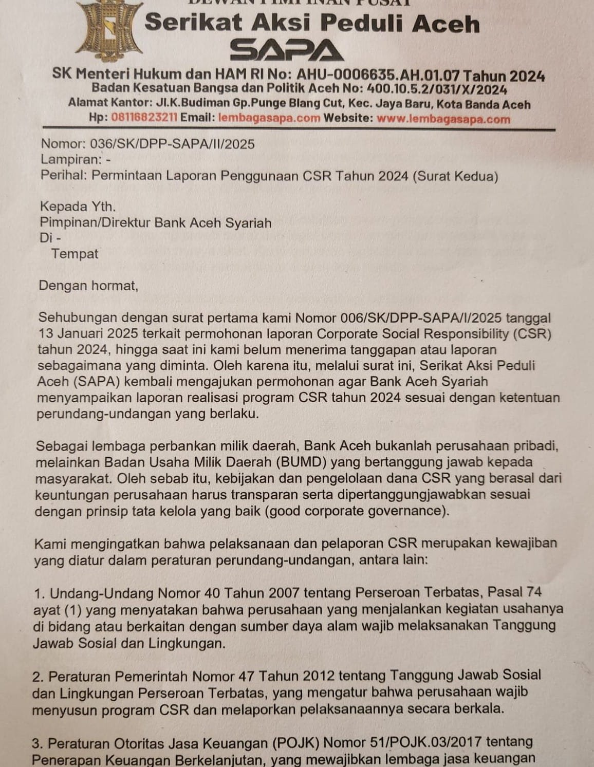 Banda Aceh – Serikat Aksi Peduli Aceh (SAPA) kembali mengirimkan surat resmi kepada Bank Aceh Syariah, mendesak transparansi dalam pelaporan dana Corporate Social Responsibility (CSR) tahun 2024.