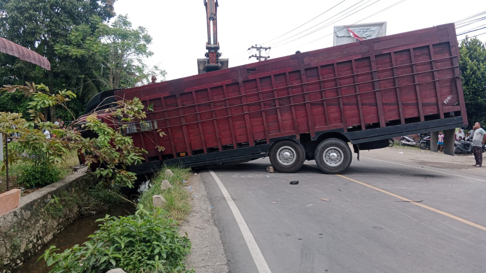 Berdasarkan informasi di lokasi, kecelakaan terjadi saat pengemudi memarkir kendaraannya di depan sebuah toko untuk menurunkan barang. Namun, akibat kelalaian, pengemudi lupa menarik rem tangan, sehingga kendaraan melaju sendiri dan akhirnya masuk ke dalam bendungan irigasi.