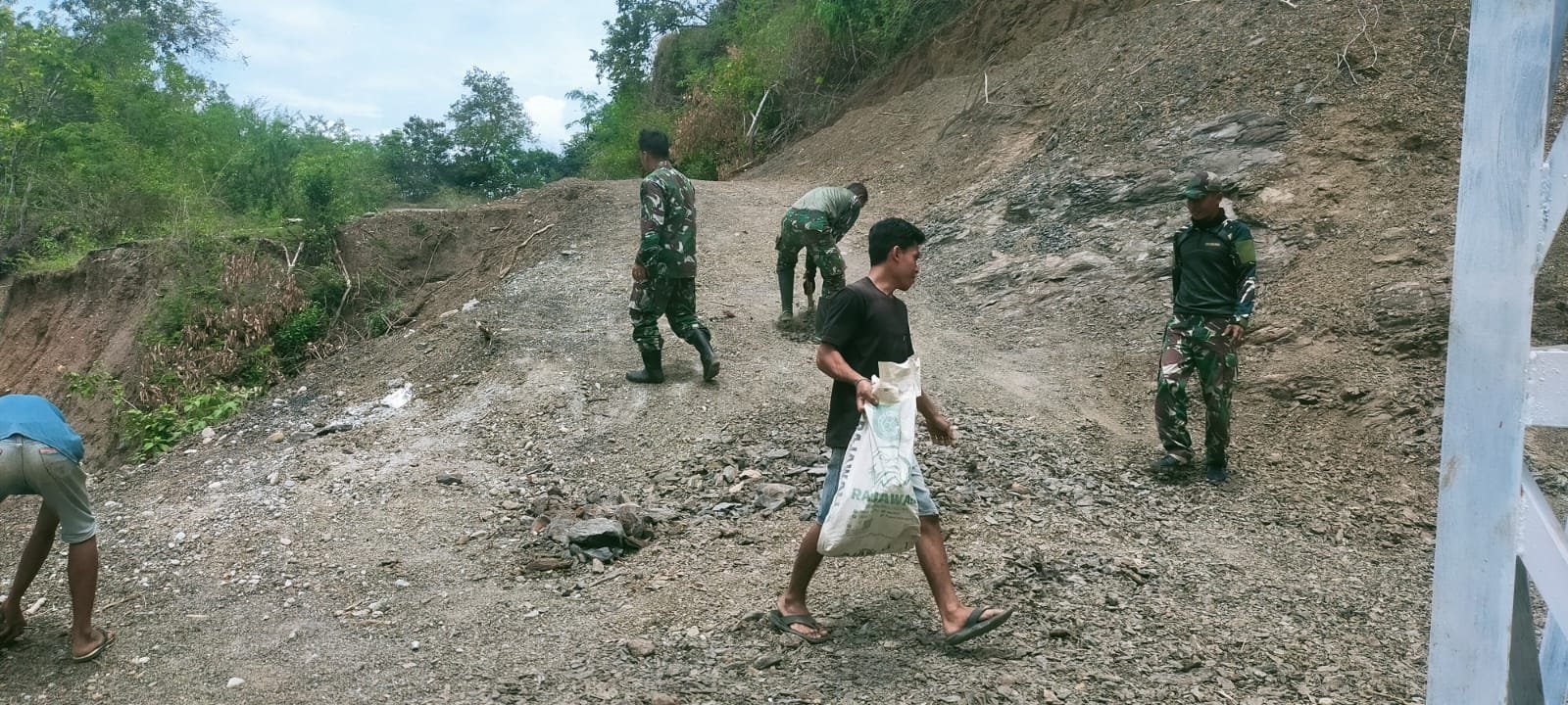 Kegiatan yang berlangsung sekitar pukul 11.00 WIB tersebut difokuskan pada pembersihan material serta perataan akses jalan menuju jembatan gantung Kala Ili yang menghubungkan Desa Owak dengan Desa Linge.