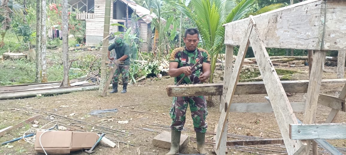 Anggota Satgas TMMD Ke-124 bersama warga sekitar tampak bahu membahu bekerja keras membangun rumah tersebut agar menjadi tempat tinggal yang layak dan nyaman bagi Tuminah.